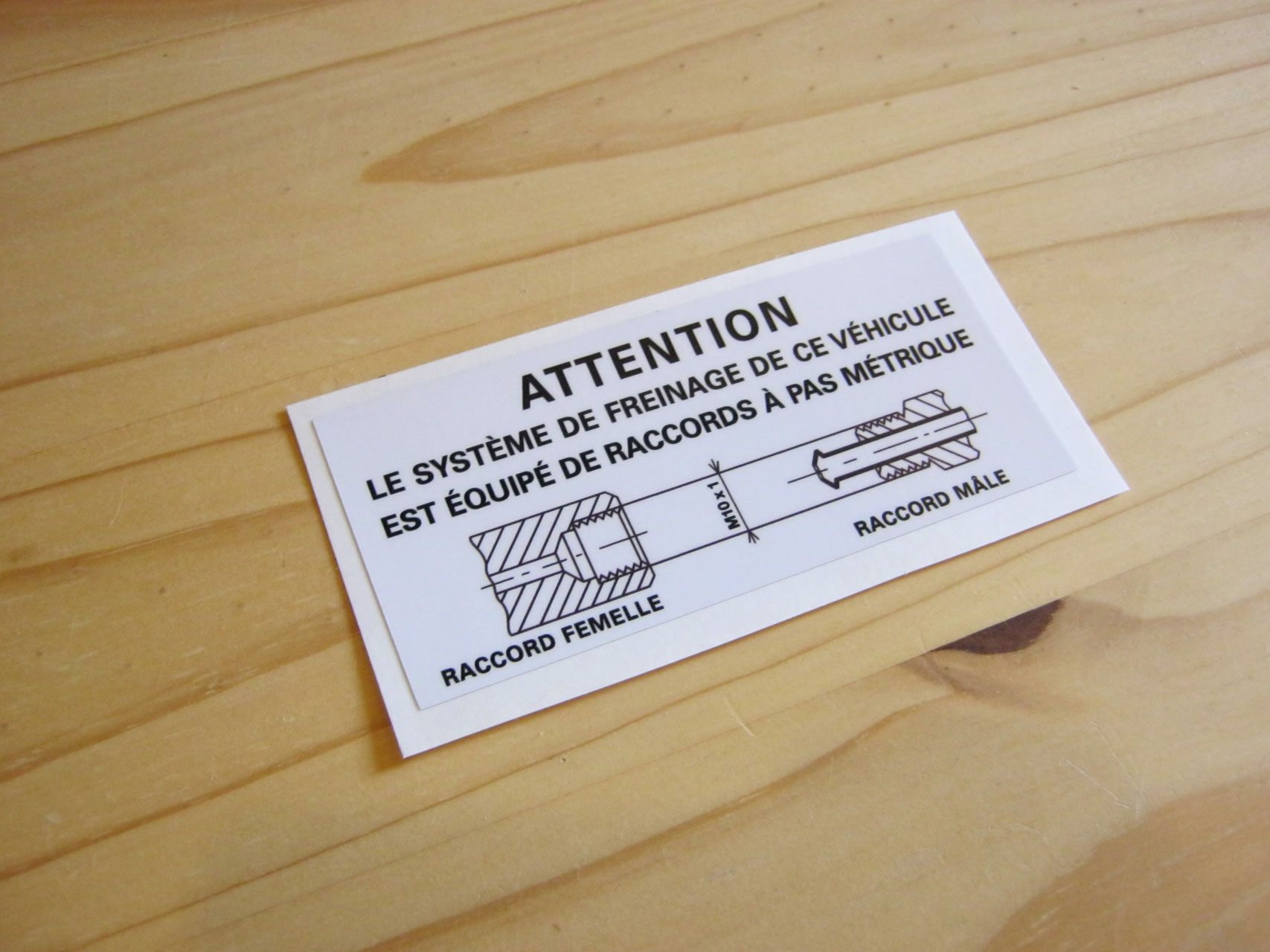 Autocollant "ATTENTION système de freinage" de traverse avant,